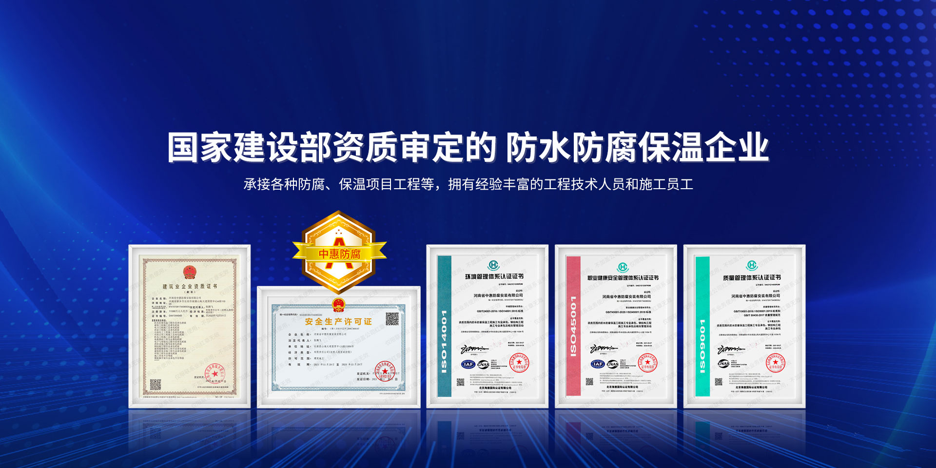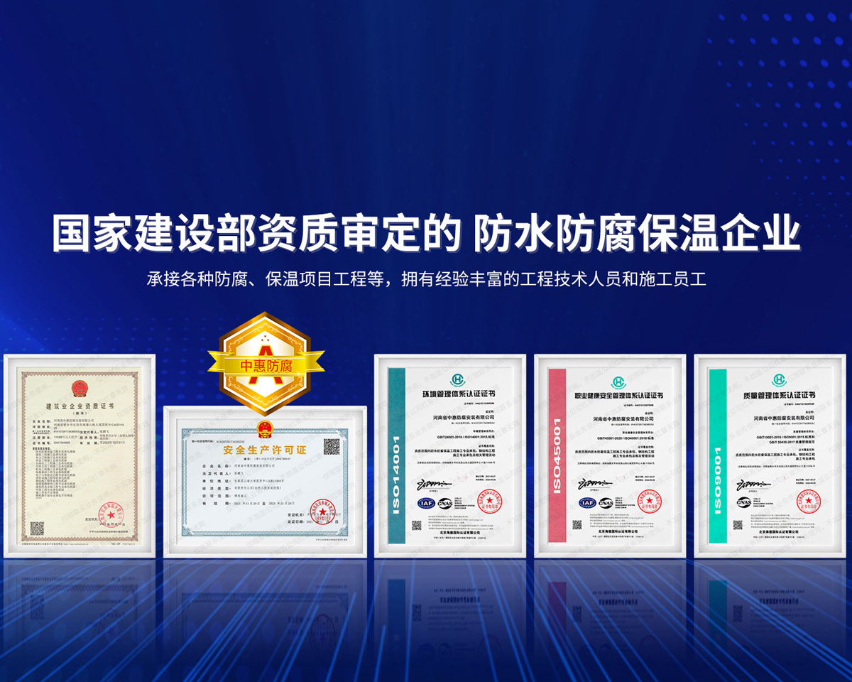 公司經營范圍:防水防腐保溫工程;消防設施工程;建筑裝修裝飾工程;建筑機電安裝工程;電力工程;建筑工程;石油化工工程;工業清洗工程;油罐清洗工程;鋼結構工程;環保工程;模板腳手架工程;電纜防火封堵、防污閃噴涂、外墻外保溫工程;各類施工勞務作業;設備維修、船舶鉚焊、涂裝;電力工程材料、建材、防水材料、防火材料、防腐保溫材料銷售,并相繼通過了GB/T19001-2008idtISO9001:2008GB/T50430-2007質量管理體系認證證書。GB/T24001-2004idtISO14001:2004環境管理體系認證證書。GB/T28001-2011idtOHSAS18001:2007職業健康安全管理體系認證證書。公司是中國防腐蝕于防護協會、中國施工企業管理協會、電力協會和中國鋼結構防水協會會員單位。 公司的經營業務涵蓋了石油、化工、電力、冶金、煤炭、船舶、國防、燃氣、水利、環保、交通運輸、航空及國防軍工和輕紡市政等行業的防腐保溫絕熱設備。鋼結構安裝、防火、防水、金屬噴鍍、聚脲噴繪、陰極保護、防滲透堵漏、玻璃鋼及各種磚版材料襯里、橡膠襯里、煙氣硫和耐酸溶劑腐蝕等工程施工。公司連續十年榮獲“省市先進施工企業”“安全生產先進單位”“重合同,守信用企業”和“AA***資質企業”的稱號。2000年被命名為市級文明單位,2002年被國家工商行政管理局命名為“重合同,守信用的企業”、被中國工業防腐蝕技術協會命名為“防腐蝕企業,能源節約及環境保護領域有豐富的經驗和***的業績。工程一次交驗合格率100%。其中攀枝花鋼鐵公司煉鐵廠四號高爐及熱風爐防腐工程、上海寶鋼公司煤氣柜防腐工程、撫順石油一廠裝置防腐項目、齊魯石化公司稀烴廠高塔防腐工程、吉林化學工業公司煉油廠油罐防腐工程、天津石化熱電廠六號爐頂棚聯絡管保溫工程、大慶油田(太倉)力神泵業工程、中國化學工程第十一建設工程、中原油田勘探局工程、中國石化銷售有限公司華北分部、魯皖輸油管道工程、貴州開磷息烽合成氨工程、陜西黃陵煤化工程、中國石油天然氣西部管道塔里木輸油工程、邯鋼集團邯寶鋼鐵公司煉鐵工程、德州供電工程、吉寶(南通)船廠工程,偃師華潤熱力工程、鄭州熱力總公司。 河南省中惠防腐安裝有限公司愿以豐富的施工經驗,***的技術,***的設備,***的管理,***的服務,竭誠為國內外廣大的用戶提供***滿意、******的工程作品?! ∥夜驹概c國內外同仁一道,團結協作,共同推進防腐蝕行業發展! 公司地址:河南省長垣縣建設路北段360號 固定電話:0373-8866488 郵編:453400 網址:http://www_zhff_com_cn.hzjiansheng.com